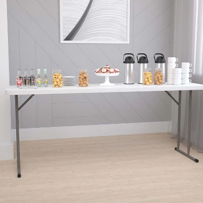 Fill that new designated training room with this narrow rectangular plastic folding table. The space saving design can fit multiple tables in small and large rooms making it the perfect training style table for any classroom or training facility. Have people pick up test packets and informational pamphlets on this perfectly sized folding table. Cleanup is simple on this durable, waterproof top to pick up spills quickly. This 6 foot folding table seats 3 people on one side of the table allowing all at the table a clear view of the board and instructor. When you want to store or transport the legs lock underneath the top. Folding tables can be your go-to table to setup your products at convention centers.