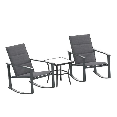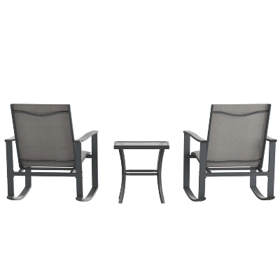 Spend some quality leisure time outdoors with this 3 piece all-weather rocking chair and table patio set. Boasting quick dry textilene flex comfort material, these rockers are perfect for poolside, patios and decks. Integrated armrests and smooth motion curved runners allow for total relaxation. The included glass topped side table not only looks great but also provides much needed horizontal real estate for drinks, cell phones, or snack plates. Powder coated steel frames are weather and rust resistant and allow the chairs to hold up to 300 lbs. static weight and the table to hold up to 50 lbs. static weight. Fixed floor glides on the table will prevent damage to your indoor flooring surfaces. Your new lounge set assembles in 30 minutes or less and wipes clean with a damp cloth making it ideal for busy households. This chair and table set is available in multiple colors to suit your personal taste.