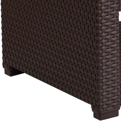 Complete your outdoor arrangement with this chocolate brown accent end table and add depth and texture to your outdoor look with a vase of summer flowers, some nautical decor or colorful glass sculptures. The durable resin frame offers a stylish appearance which replicates rattan giving you the perfect place to rest your wine glass or your tired feet. This richly colored table features a lower shelf for storing plates and glasses or your pool towels and sunscreen. No matter how you use it this table is a must have. Additional Features: Plastic Block Feet