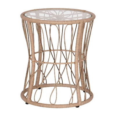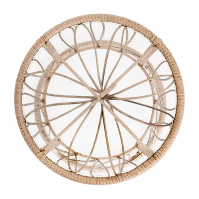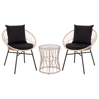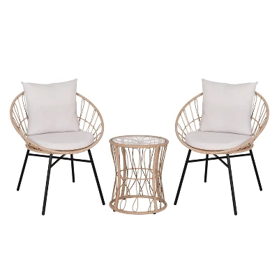 Entertain friends or relax with your morning coffee with the trendy, boho look of this 3 piece polyethylene rattan table and 2 chair set. The rounded papasan style seats, and plush, foam padded, polyester back and seat cushions will quickly become your favorite spot indoors or out. The matching accent table, with a 5mm thick tempered glass top, completes the look and gives you the perfect spot for drinks, snacks, or decorative items. Weather and fade resistant materials paired with powder coated steel frames, allow this versatile set to find a home on the deck, patio, poolside, or in the sunroom. The chairs feature fixed floor glides while the table has adjustable glides for a level, stable surface and prevents damage to hard flooring surfaces when used indoors. The table arrives preassembled and ready for use and the chairs go together in 10 minutes or less per piece for quick setup. Frames wipe clean with a damp cloth and the zippered, removable cushion covers may be wiped with damp cloth or hand washed and air dried for a deeper clean.