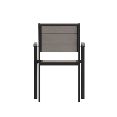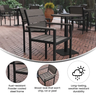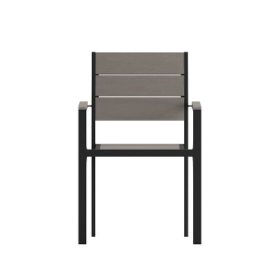 Create a first-rate dining experience at your restaurant or in the backyard with updated commercial grade seating. Designed for use in the hospitality industry, as well as your busy household this attractive outdoor dining chair with arms features poly resin slats that mimic the look of wood without the maintenance. UV treated to prevent fading this patio chair will look great season after season. Rust resistant powder coating covers the sturdy welded metal frame capable of holding up to 300 lbs. static weight. The lightweight design allows for a recommend stack quantity of up to 8 chairs high for easy storage and nightly cleanup. Use this chair in your kitchen or dining room without worry, the fixed floor glides will protect your indoor flooring. Arriving ready for use, these dining chairs wipe clean with a damp cloth for quick seating turnaround.